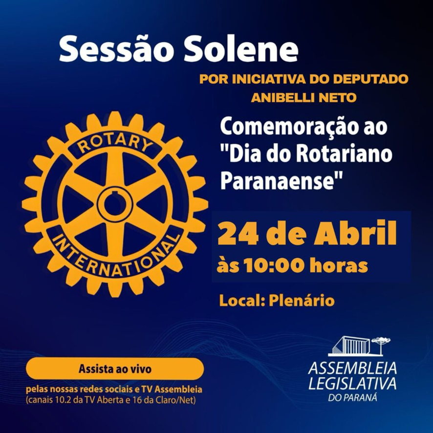 A Assembleia Legislativa do Estado do Paraná – Alep, por iniciativa proposta e presidida pelo deputado Anibelli Neto promoverá a sessão solene em comemoração ao Dia do Rotariano Paranaense.